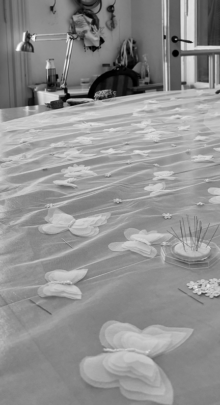 Application of seed beads, sequins, and over 250 organza butterflies. Client: Rocío-Rivero Bridal